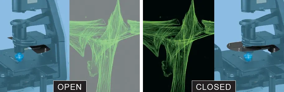 Phụ kiện Contrast Shield tùy chọn giúp chặn ánh sáng phòng, cung cấp một phương pháp dễ dàng và tiết kiệm chi phí để đạt được khả năng quan sát huỳnh quang có tỷ lệ tín hiệu trên nhiễu cao trong phòng thí nghiệm có ánh sáng mạnh.