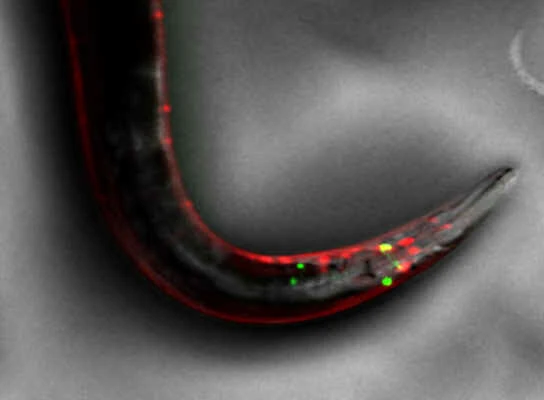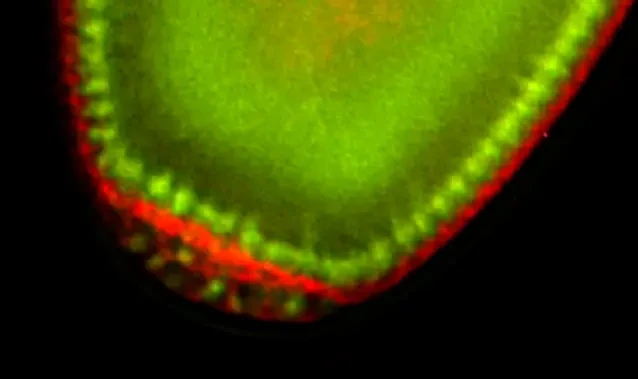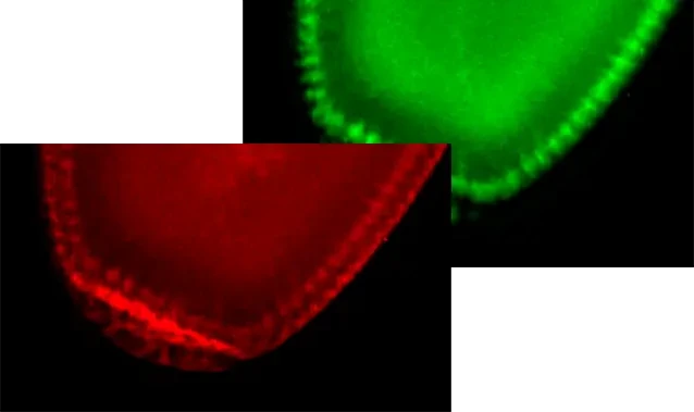Hình ảnh các tế bào riêng lẻ được phân giải trong phôi ruồi giấm sống biểu hiện GFP và mCherry (Sử dụng SHR Plan Apo 2X ở độ phóng đại 8X với SMZ25).