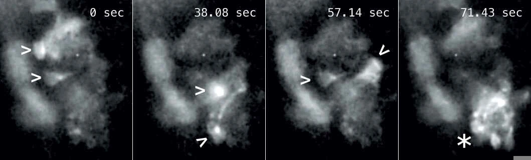 Hình ảnh tua nhanh thời gian của các tế bào thần kinh biểu hiện GCaMP bên trong một con cá ngựa vằn sống cho thấy các tế bào thần kinh riêng lẻ phát xung ở các thời điểm khác nhau (mũi tên). Khung hình cuối cùng cho thấy toàn bộ một cụm tế bào thần kinh phát xung (dấu sao).