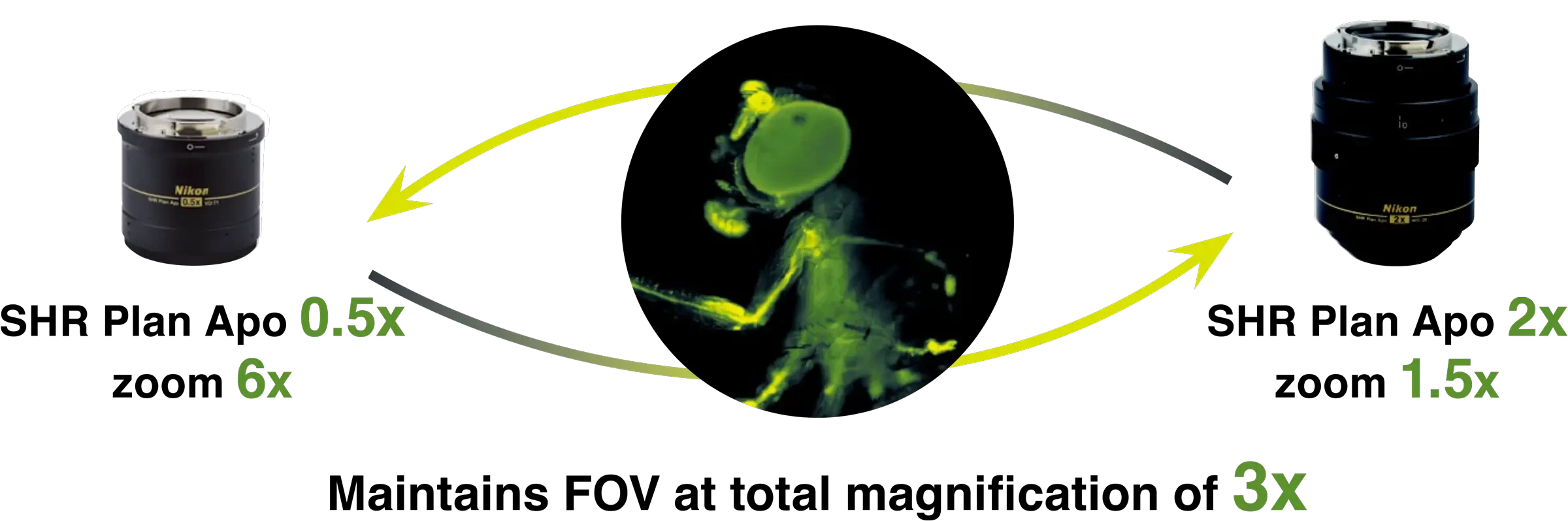 Hệ thống quang học mới được Nikon phát triển mang lại sự cải thiện đáng kể về tỷ lệ tín hiệu trên nhiễu (S/N) ngay cả ở độ phóng đại cao. Tỷ lệ S/N được cải thiện này giúp thu được các tín hiệu huỳnh quang yếu và các sự kiện nhạy sáng như phân chia tế bào, điều khó thực hiện với kính hiển vi soi nổi thông thường.